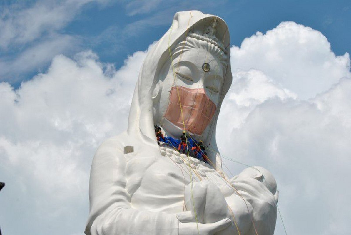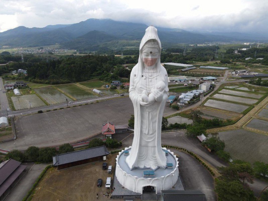 Workers scaled a giant statue of a Buddhist goddess in Japan on Tuesday to place a custom-made mask on her face, an act meant to be a prayer for the end of the coronavirus pandemic.