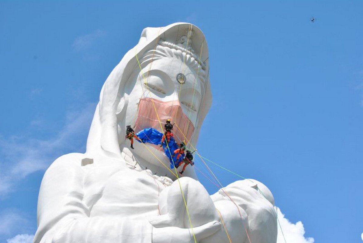 They then unfurled the mask made with pink net fabric, measuring 4.1 m by 5.3 m and weighing 35 kg (77 pounds), across the lower half of the statue’s face.